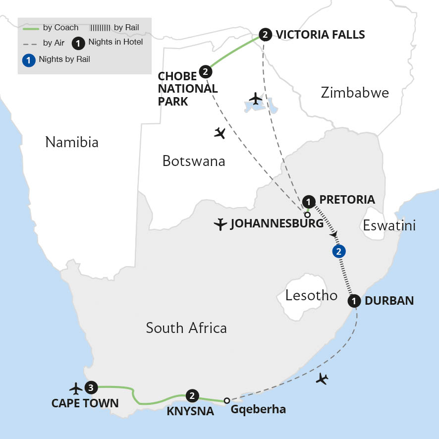 Join us on this sensational tour of Southern Africa, from the glorious Victoria Falls to the multicultural city of Cape Town, with fantastic wildlife viewing in Botswana's Chobe National Park and Nambiti Reserve in Kwa-Zulu Natal. Added to these superb experiences, a rail journey from the city of Pretoria to the coastal metropolis of Durban on...
