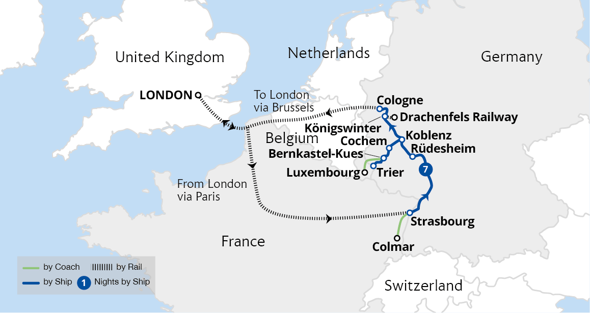 Become part of the sensational Rhine in Flames spectacle during this seven-night luxury river cruise from Cologne to Strasbourg. Explore historic Koblenz and admire panoramic views of the Rhine Valley aboard the Drachenfels Railway, before enjoying a dazzling fireworks display from the front-row seats of our ship in St Goar. Continuing...