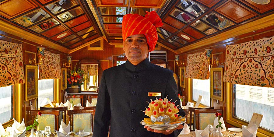 On board the Palace on Wheels, travellers get a glimpse into the lives of the former Maharajas of India. The beautifully restored luxury train is comprised of fourteen saloon cars. Each car was originally built to be a personal carriage of a former ruler of India's Rajput states, and are named accordingly. The saloon carriages have been restored and decorated to reflect the cultural ethos of each royal state, and give travellers a real sense of the royal history of the train. The Palace on Wheels has two restaurant cars, The Mahārāja and The Mahārāni, serving beautiful food inspired by cuisines from around the world. A bar and loungecarriage is opulently decorated and perfect for enjoying a perfectly mixed cocktail, or fragrant coffee while India's landscape passes by the window. The luxury of the train is echoed in the spa saloon car, where guests can enjoy a massage or choose from a range of spa treatments. The moving palace can accommodate just over one hundred guests, with four private rooms to each saloon car, each private room is elegantly decorated and fitted with an en-suite bathroom and shower. There are two saloon attendants for each eight guests, which is more than enjoyed by royalty. The saloon attendants are there to ensure maximum comfort during the journey, and give travellers a taste of the royal Indian lifestyle.