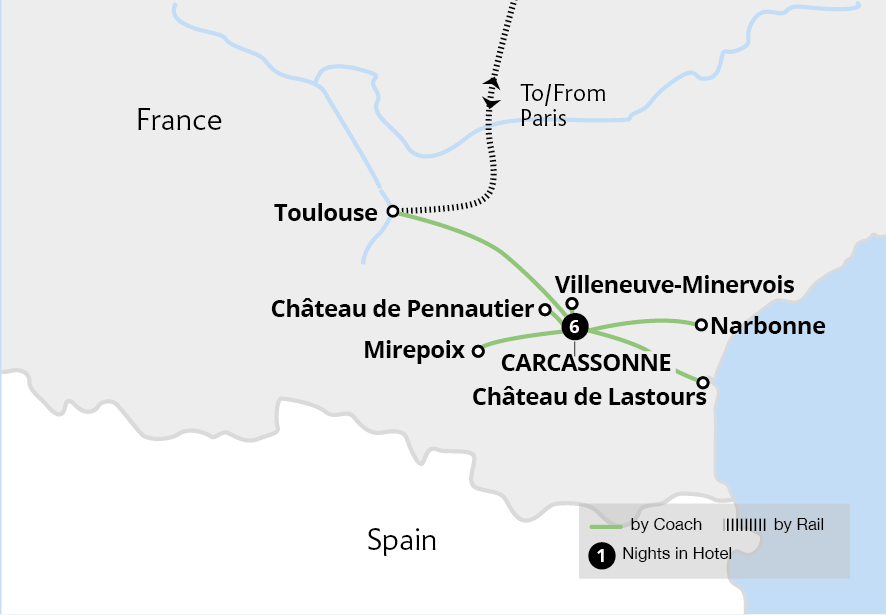 Leaving our Carcassonne hotel after breakfast, we transfer to Toulouse by coach and continue by First Class train to Paris. In the French capital, we join the Eurostar service to London, travelling in Plus class with a light meal served at our seats. Arriving back at St Pancras, your fantastic French holiday comes to a conclusion.