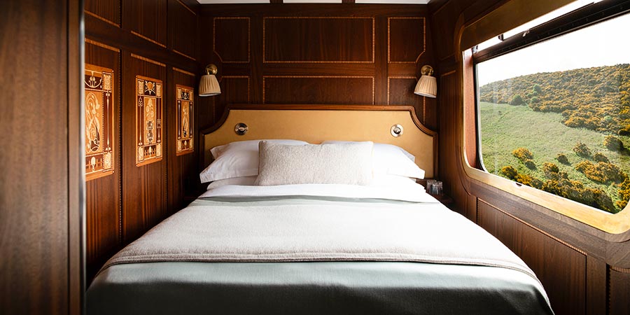 You and a travel companion enjoy a private Highland retreat in the Royal Scotsman's Twin Cabins. Designed with rest and relaxation in mind, these cabins include two lower twin-sized beds, both plush with sumptuous bedding. Each of the 12 Twin Cabins features a well-designed ensuite bathroom with a shower and an unforgettable perspective on the passing mountains, valleys and lochs.
